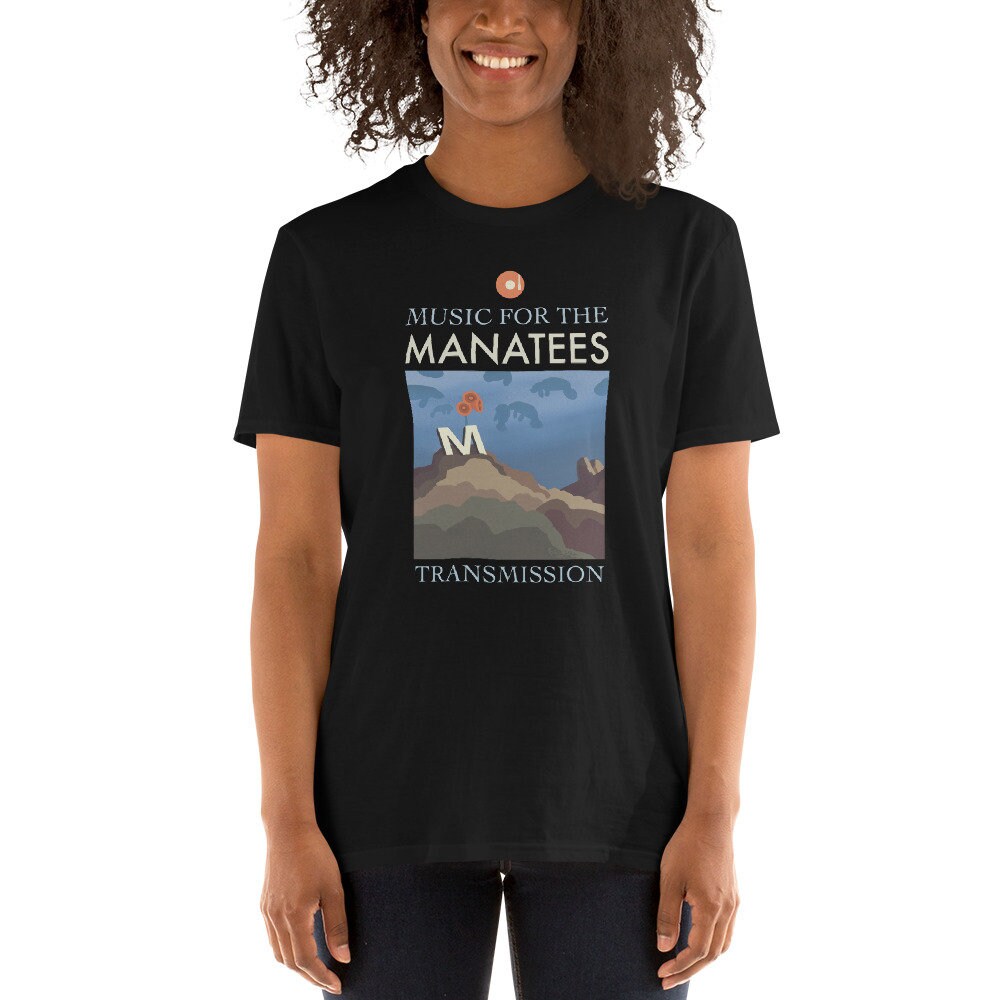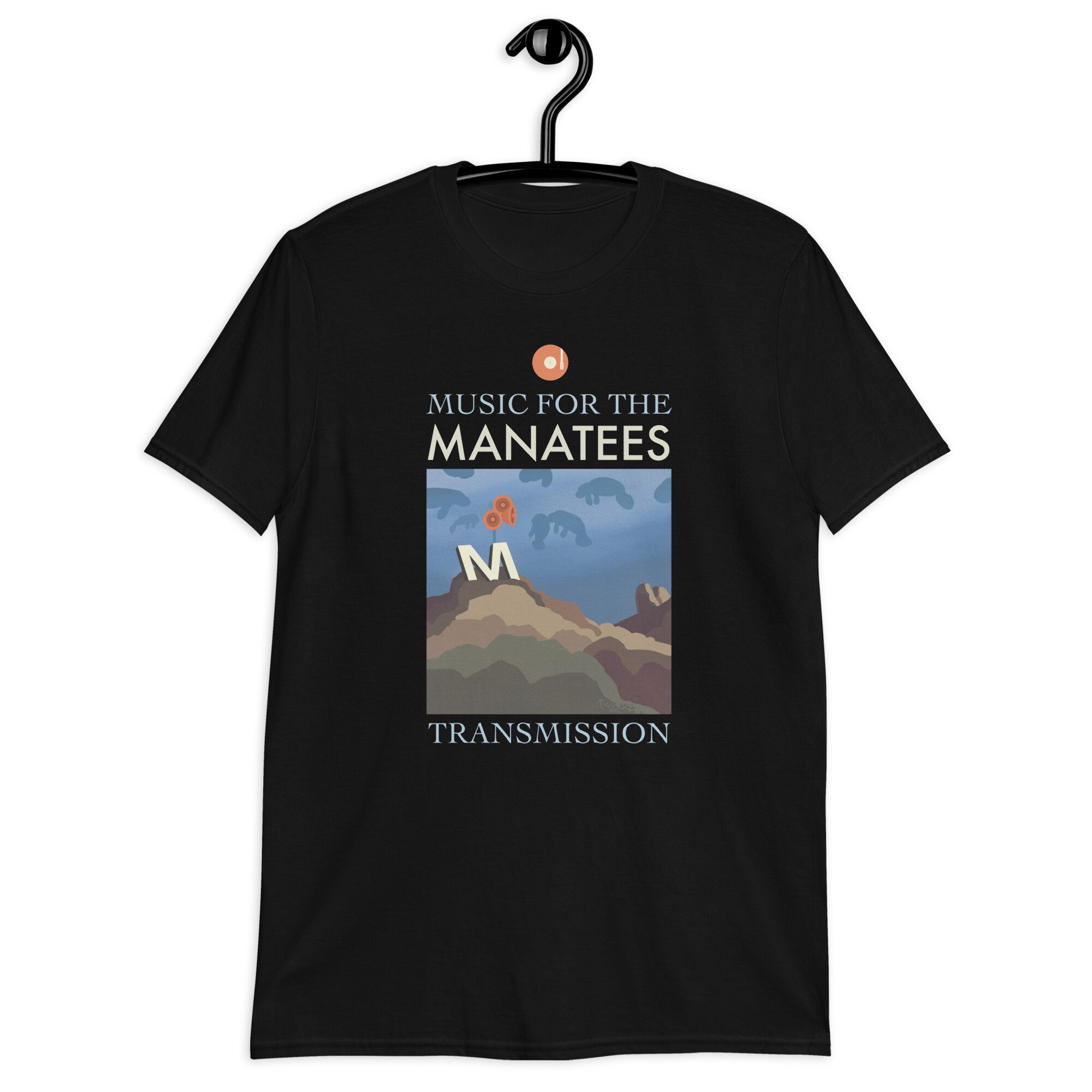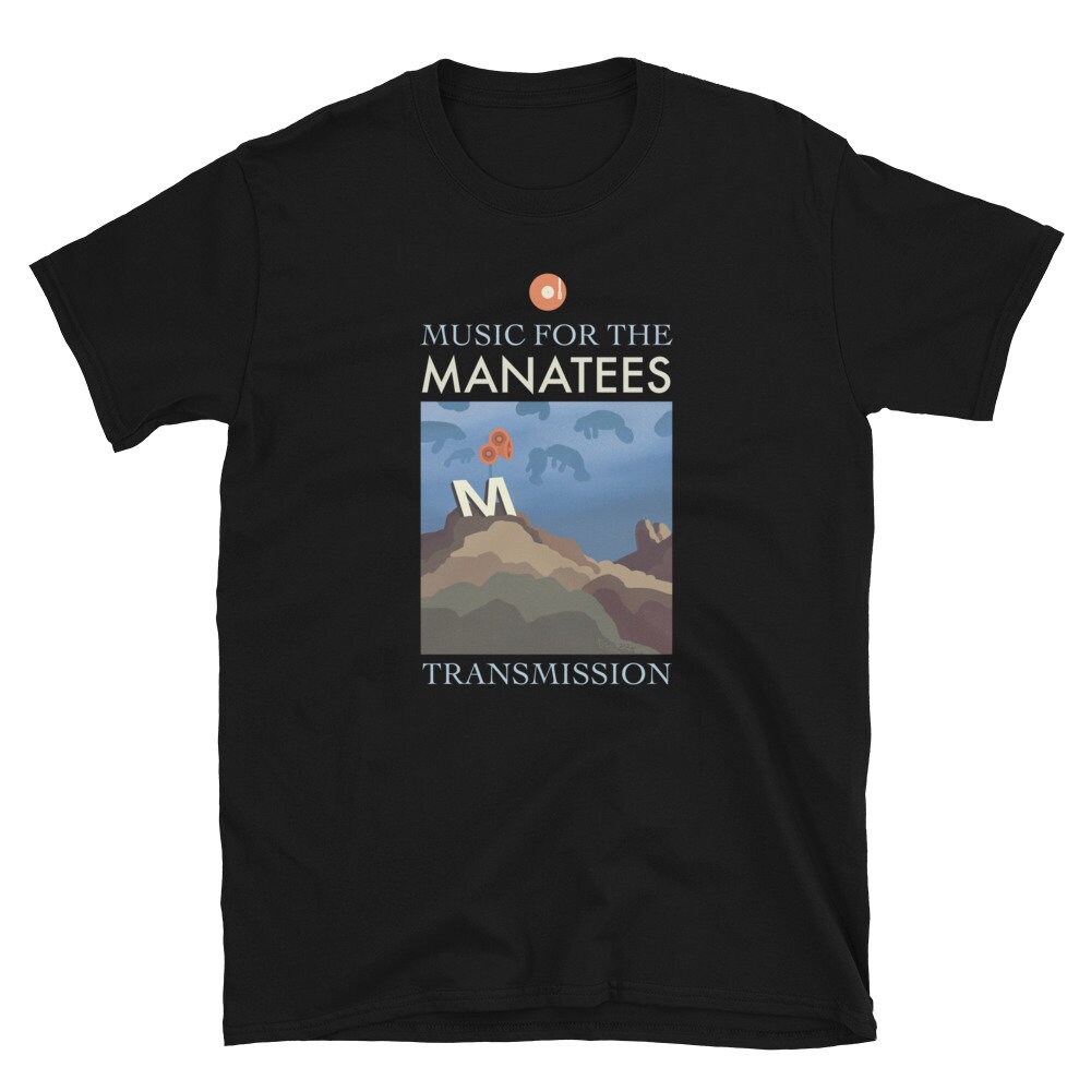 I’m taking a ride with my best Manatee friends to hear DJ Jake Rudh play on Transmission Night. This design is a parody of the album art for the 1998 Tribute to Depeche Mode, titled “For the Masses,” with an underwater twist. Friendly blue Manatees float around the orange megaphones, listening to classic New Wave, Dark Wave, and Pontoon Rock every Wednesday and weekend, transmitted through the internet waves.