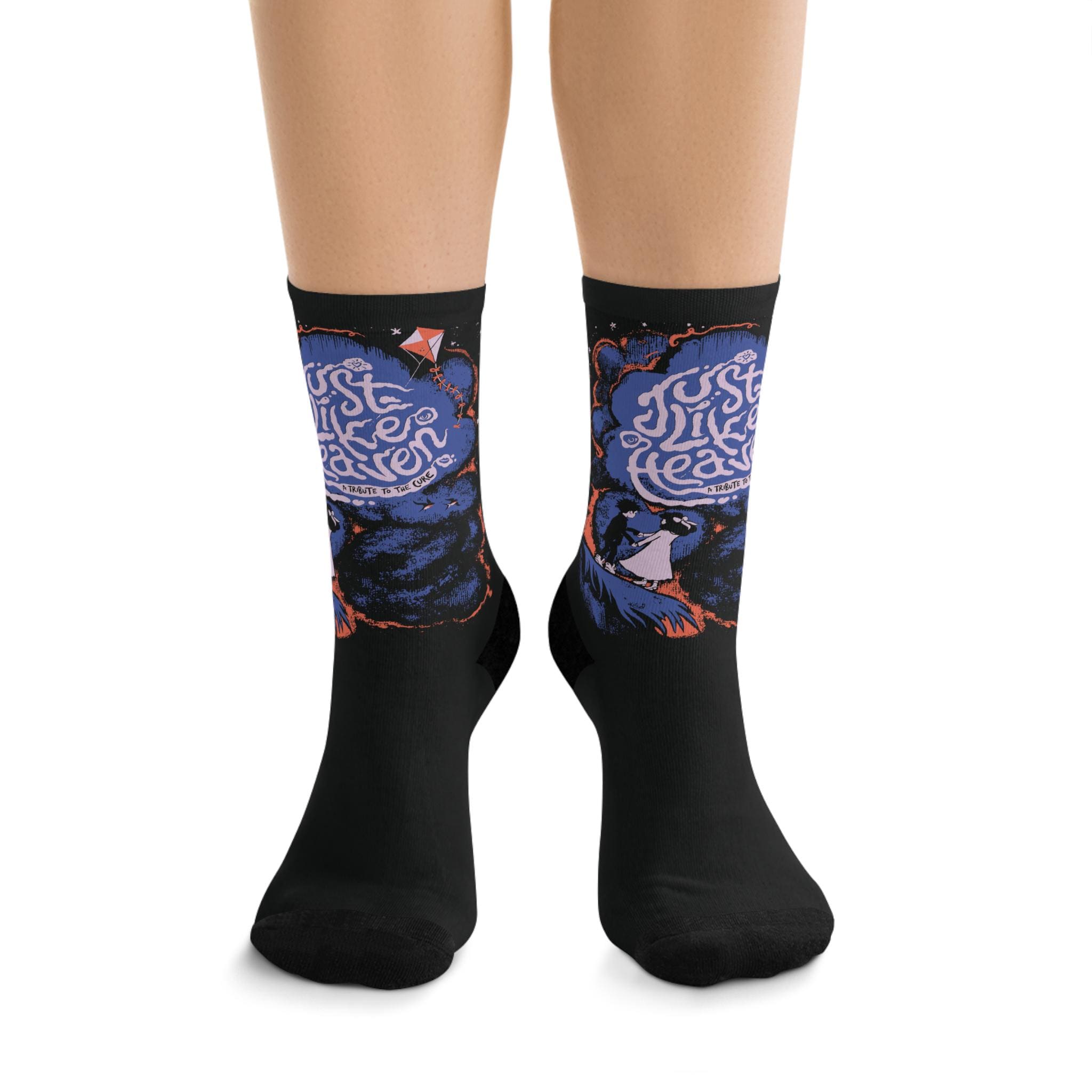 These premium socks with the Just Like Heaven art by Kate at Curethreads featuring Robert and Mary dancing on a cliff are whimsical and dreamy. Perfect for fans of The Cure, these sustainable socks made from recycled materials are ideal for everyday wear or as a special gift for Cureheads and music lovers. Relevant for birthdays, holidays, or any occasion where a pop of artistic flair is needed.