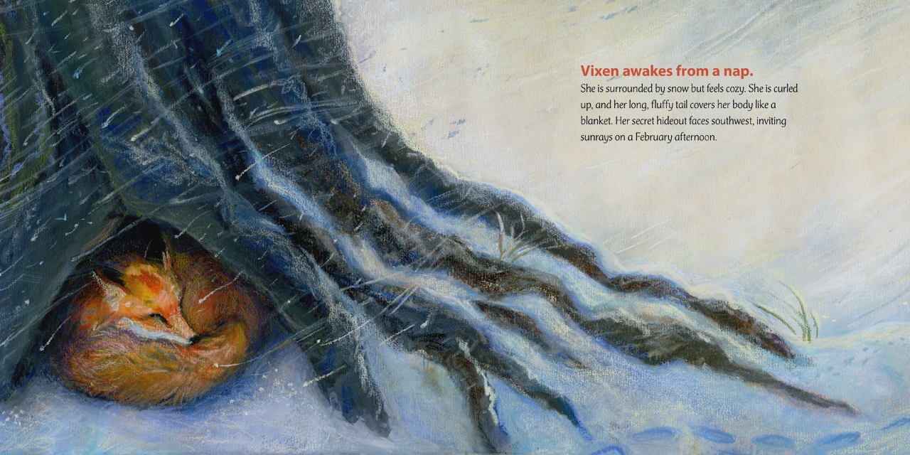 ★ Gr 1-4 –Beginning on a snowy afternoon in February and ending in early autumn, this book centers on a fox named Vixen as she explores her habitat, hunts, runs from danger, and starts a family. This intimate and personal view into Vixen’s life is chronicled through a beautifully cohesive relationship between text and illustration. Facts and definitions are seamlessly woven into the narrative. When Vixen sniffs the air, readers learn that “a fox is a canine, related to dogs and wolves. Canines have super sensitive noses and ears. Vixen can smell faint odors and hear tiny sounds that a human would never hear.” Readers later witness a combination of Vixen’s senses put to use when she leaps and dives to capture a mouse hidden underneath a foot of snow. Conveying the intensity and precision of this specific hunt, the art, rendered with pastels and aqua crayons on sanded paper, also fuels the foxlike moments with emotion, from Vixen and her mate’s tender nuzzle to the curiosity and playfulness of her four kits. Additional facts are located in the back matter. VERDICT A rich reading experience awaits those who pick up this title about an animal that is not only currently trending in popular and kid lit culture (Disney’s Zootopia, Sara Pennypacker’s Pax) but is also a perennial favorite.–Joanna K. Fabicon, Los Angeles Public Library, School Library Journal